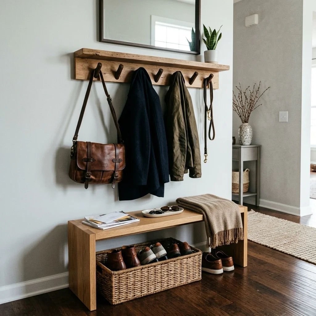 The Discrete Shoe Basket: Don't aim for perfectly lined-up shoes. Aim for "contained chaos." A large, high-quality basket allows the family to drop shoes and go, keeping the visual noise low.
